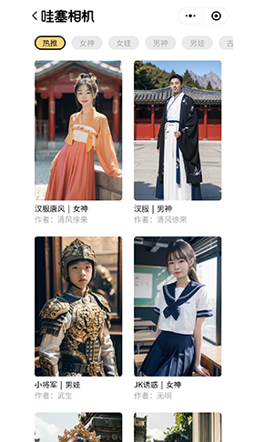 这里有上百种风格,覆盖古代传统服饰、异国风情旅拍、国内山水体验,在哇塞相机,女神、男神、男娃、女娃都可找到属于自己的独属风格